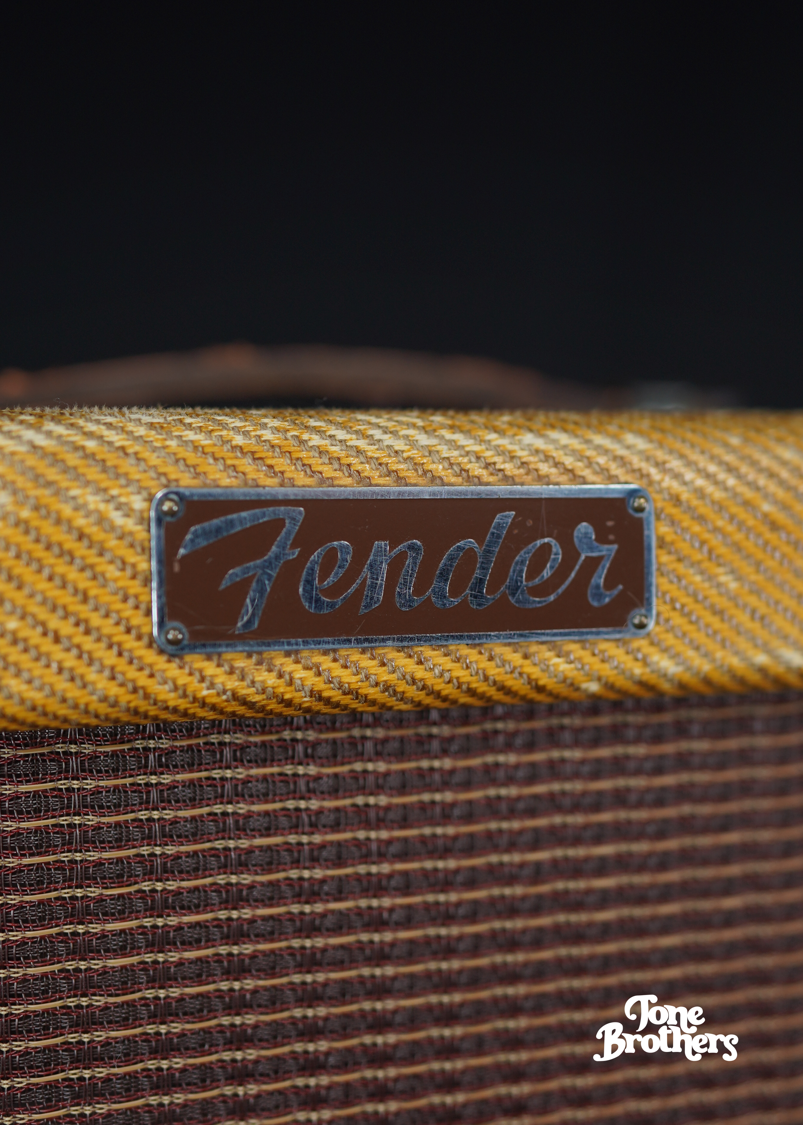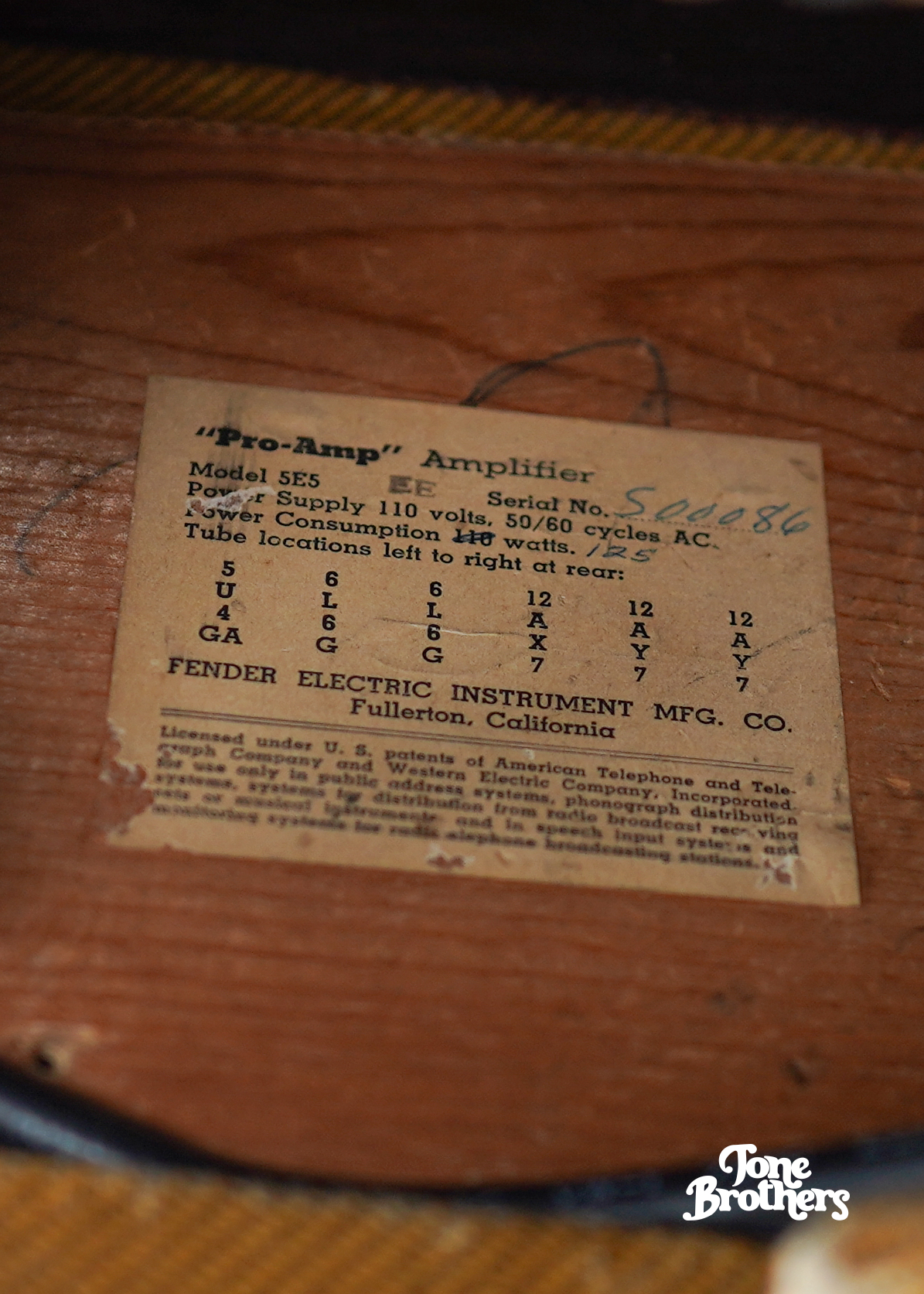 • Important notes: This is a recent acquisition for us... our second and equally clean, 5E5 Pro! The rarest narrow panel Tweed circuit; it's estimated that less than 40 were everproduced. The 5E5 was produced for only a couple of months starting in Spring 1955. It sounds nothing like the 5E5-A fixed-bias variant that appears in the fall of 55' (which is pretty much identical to the 5F4 Super and 5E7 Bandmaster circuit-wise). The 5E5 is instead almost identical circuit-wise to the fabled 5E3 Deluxe, EXCEPT it has 6L6's tubes, is more clear, has more power and pushes more air. The 5E5 does NOT sound like you're playing through a 15" Jensen, the breakup tone is very similar to the 5E3 (which uses a 12" P12R speaker), smooth and cutting. FUN FACT: the 5E5 actually pre-dates the 5E3... so technically you could say that the 5E3 is based on the 5E5 and not the other way around. This one is serial # S00086 (our other one is #S00091), but it is NOT the 86th 5E5 Pro; this is because the Pro, Bandmaster and Super all shared the same chassis serial number codes SXXXXXX. We also own another 1955 Pro serial # S00127. Though it's only a handful of serial numbers away from this one, S00127 is the later 5E5-A fixed bias vaiant. Based on this we estimate that less than 127 Pros, Bandmasters and Supers were produced before the 5E5 variant was discontinued; if a third of those amps were Pros, then only around ~40 were ever made! How can you instantly tell if a Pro is a 5E5 vs a 5E5-A? Simply look at the knobs; if the amp has 3 knobs (like a 5E3 Deluxe), it's a 5E5, if it has 5, it's a 5E5-A.