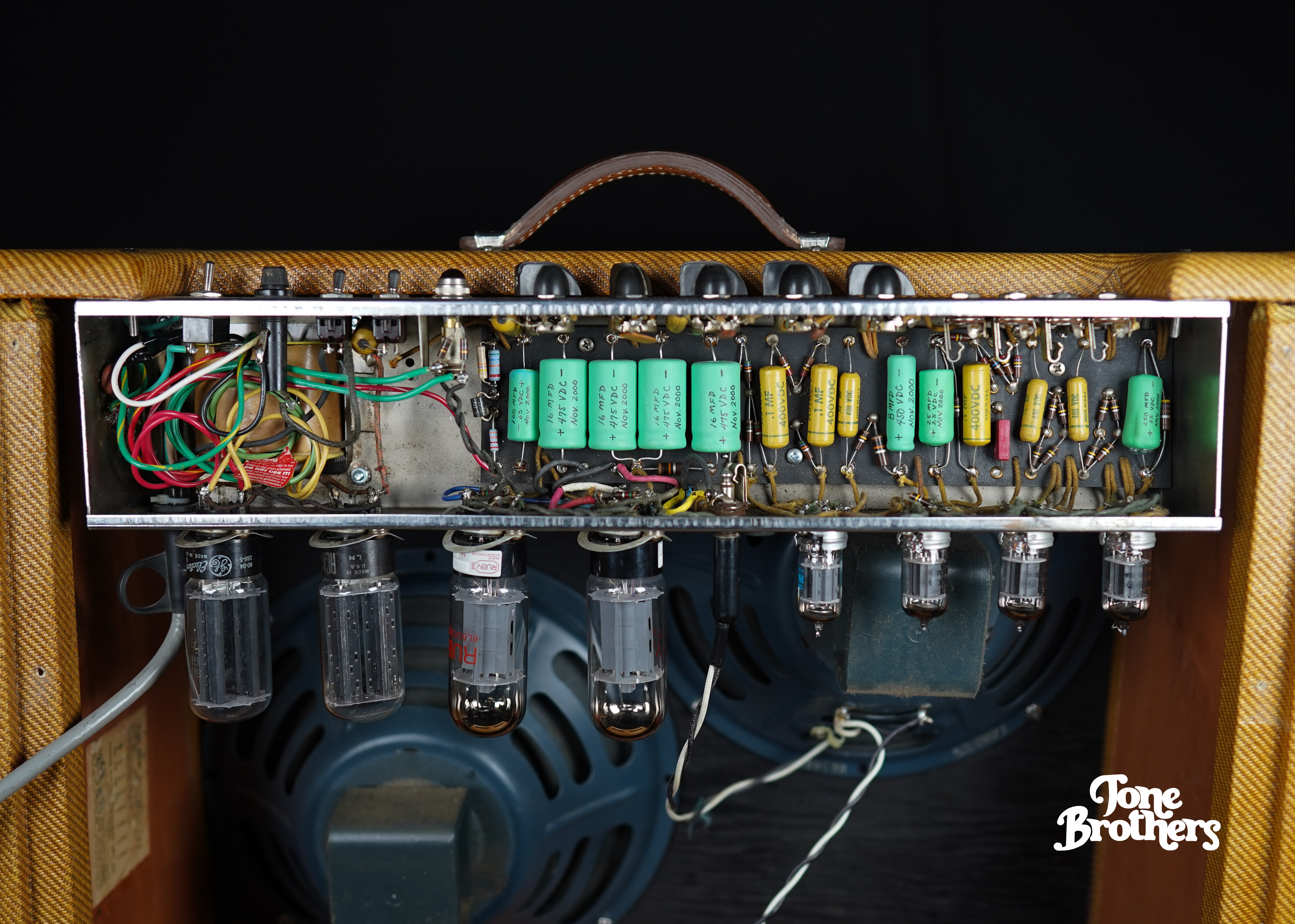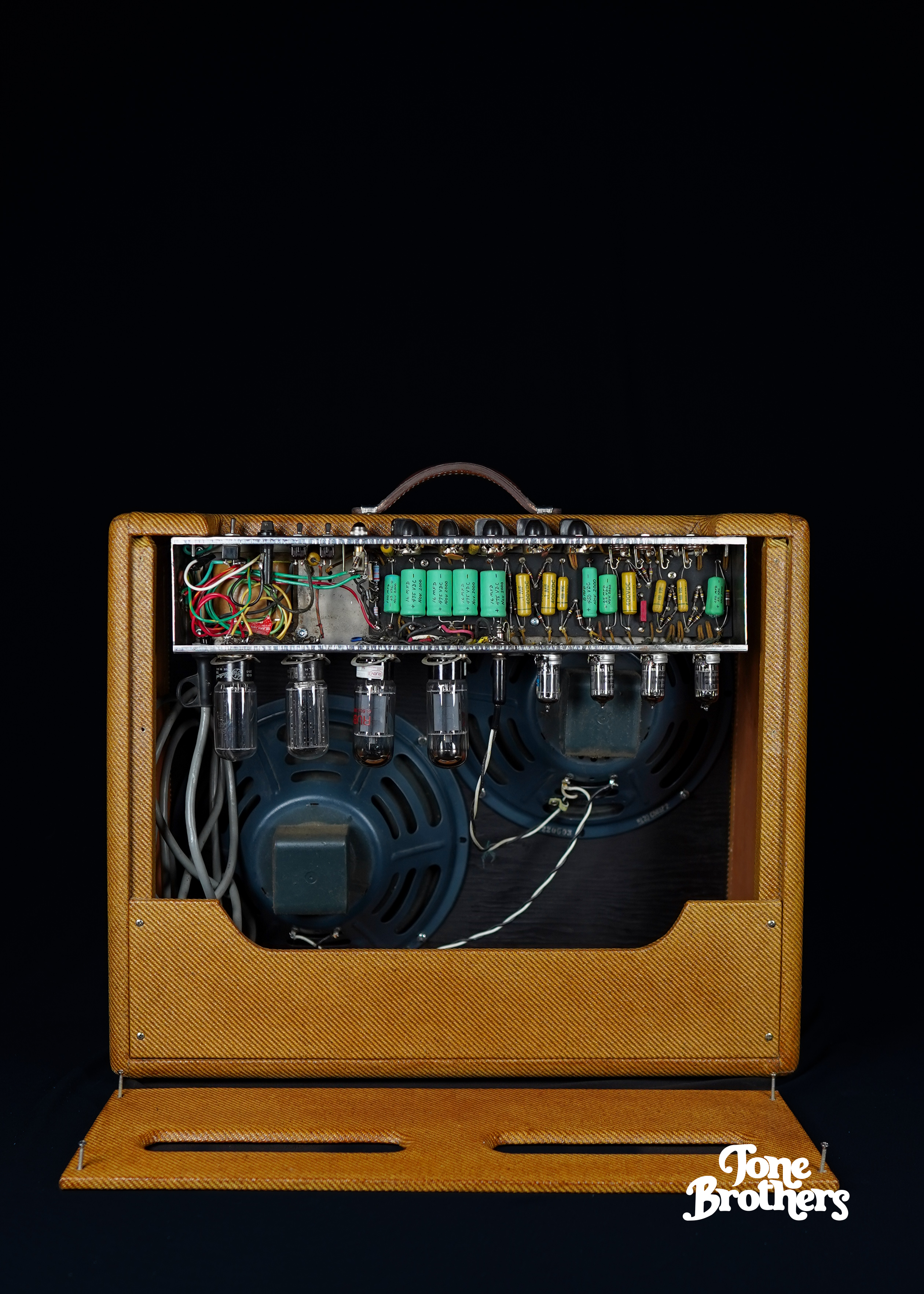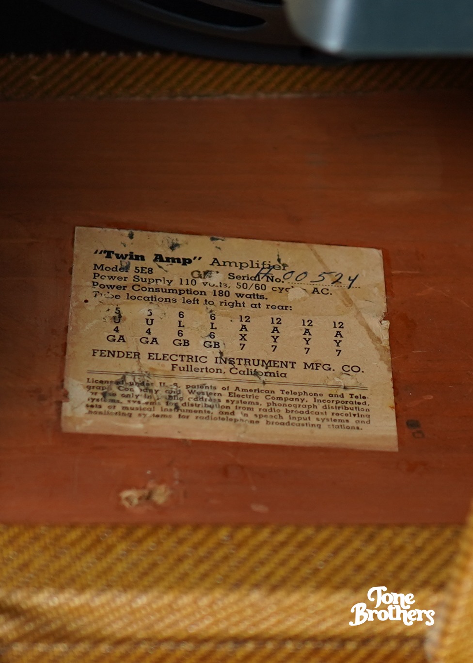 - Important notes: the fabled Tweed Twin... we are pleased to present this beautiful 5E8-A Fender Tweed Twin from 1956. We love our Tweeds (see last photo) and this is a great sounding example! The amp is all original save for 1) very professional retweed 2) power transformer replacement 3) 2 small plugged holes in the chassis and repro handle. The amp has been fully serviced with a recap and a 3-prong power cable. The original speakers have been repainted during the retweed process but the areas with the original date codes and part numbers remain untouched.