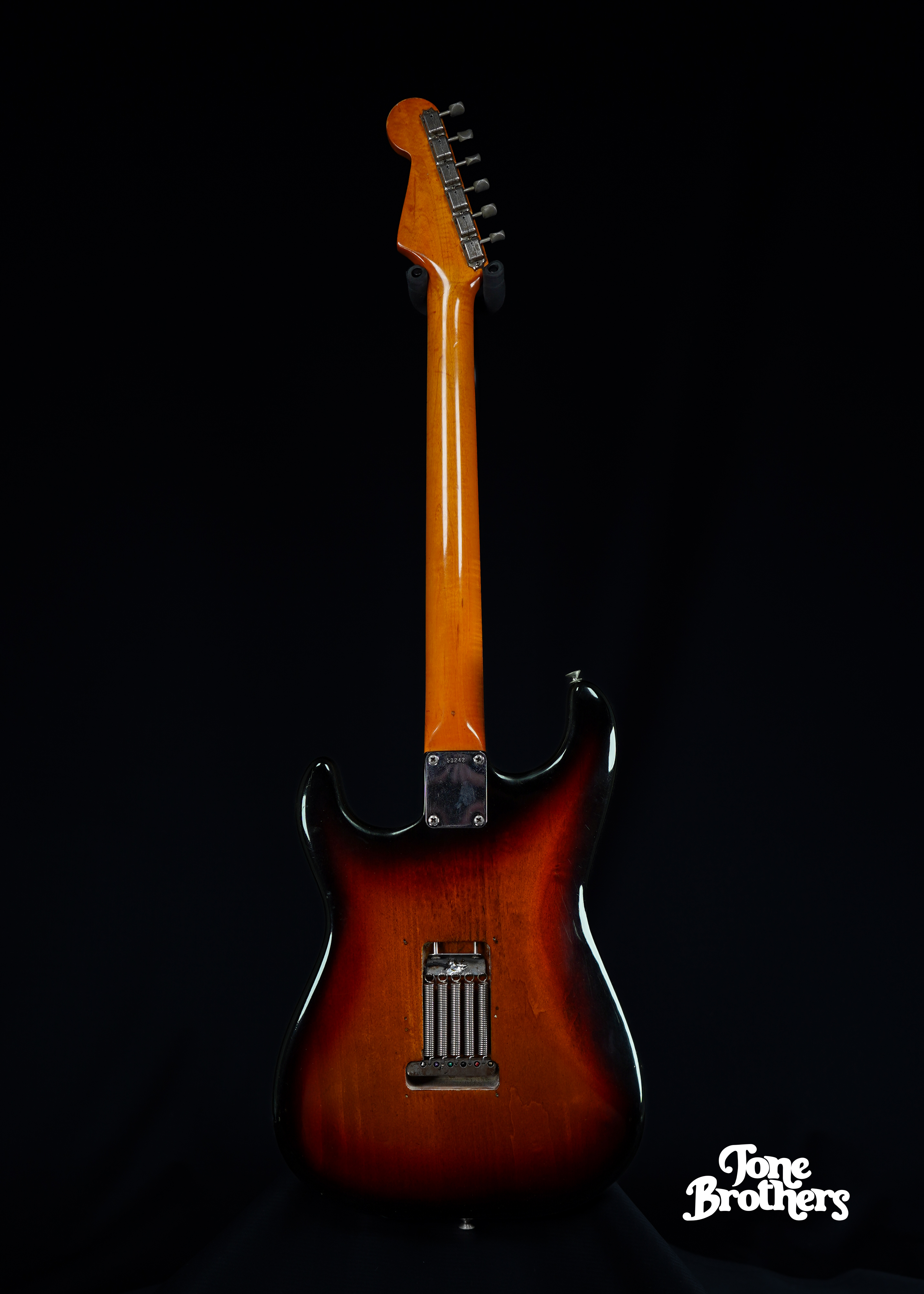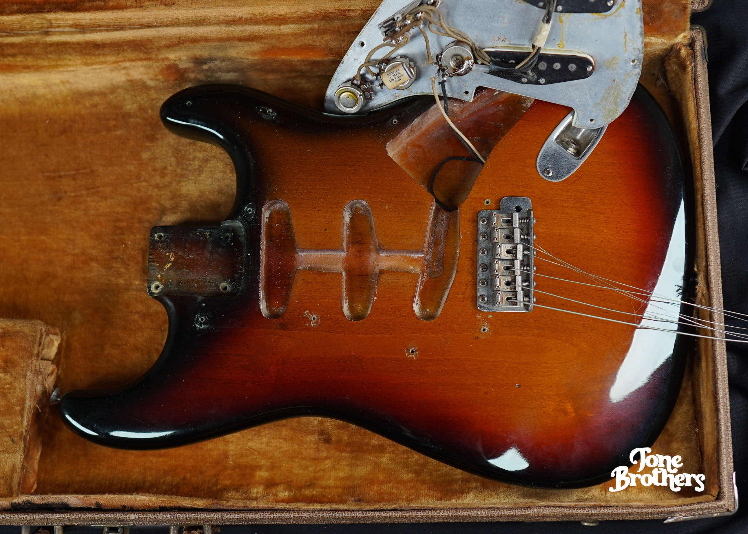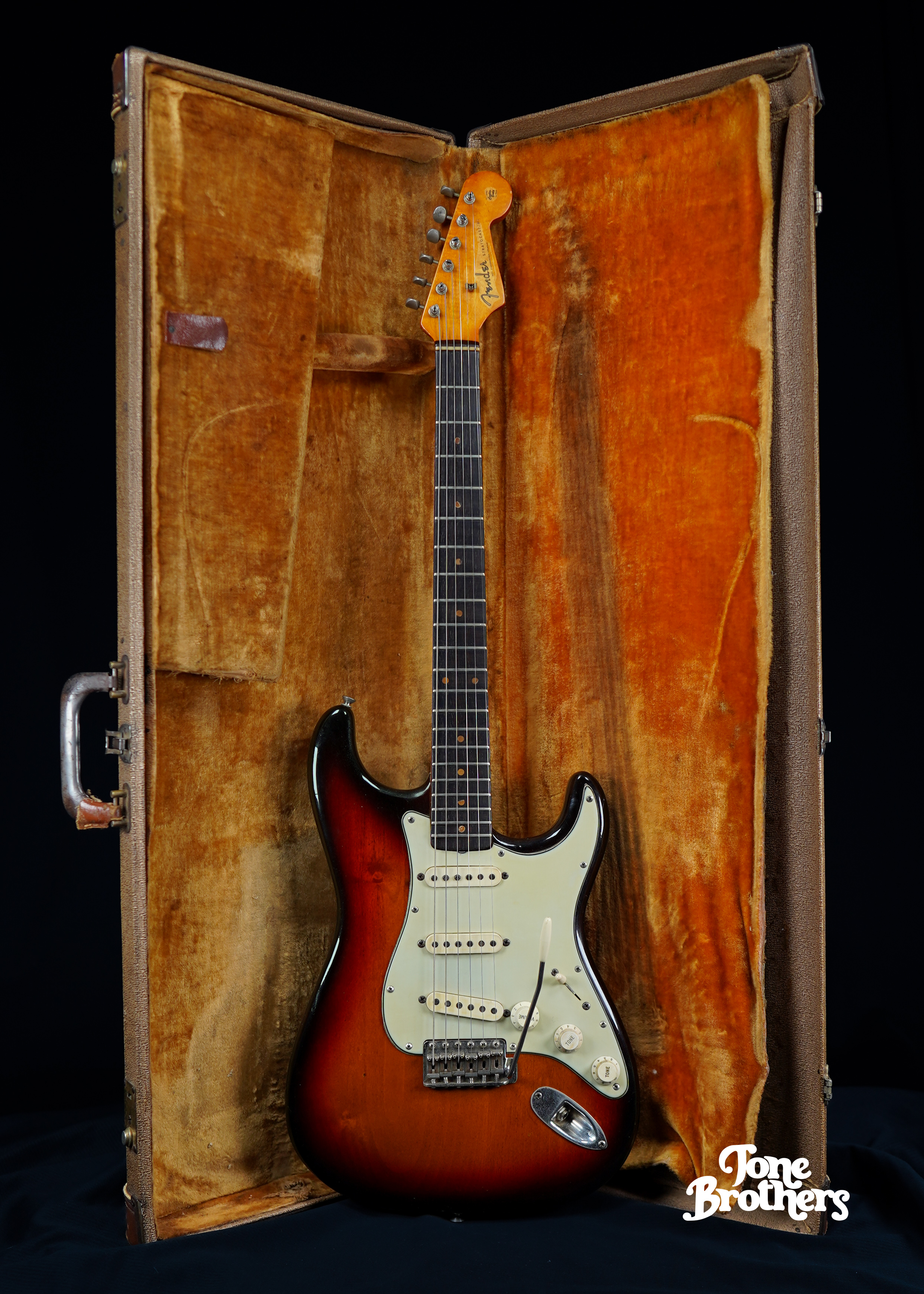 - Important notes: one of the best playing and sounding slabboard pre-CBS strats we've had in a while (and we get a dozen or two of them coming through the shop every year). We are pleased to present this 1960 Fender Stratocaster housed in its original case. The guitar is all original save for i) a professional refret / slight overspray on the back of the neck ii) partial body-only refinish (original finish was partially stripped underneath the new one and still shows up under blacklight, especially around the edges of the body), iii) volume pot replaced with a pot from 1966 iv) two of the three knobs are repros. The guitar only weighs 7.1LB and comes with its original case, original tremolo plate cover, and original tremolo bar. Ready to be played and loved for another 65 years!